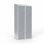 Skoleskab, helsvejst 2x400 med skråt tag. Z-døre. Lys grå kabinet (RAL 7035) med pulverlakeret ståldør grå (RAL 7040). Leveres med færdigmonteret greb for hængelås ASSA 3906. Indretningen består af to hylder, en garderobestang med to ankerkroge pr. rum. Totalmål (b x d x h) 800 x 550 x 1900 mm