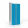 Skoleskab, helsvejst 2x400 med skråt tag. Z-døre. Lys grå kabinet (RAL 7035) med pulverlakeret ståldør lys blå (RAL 5012). Leveres med færdigmonteret greb for hængelås ASSA 3906. Indretningen består af to hylder, en garderobestang med to ankerkroge pr. rum. Totalmål (b x d x h) 800 x 550 x 1900 mm
