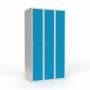 Skoleskab, helsvejst 3x300 med lige tag. 1 rum i højden. Lys grå kabinet (RAL 7035) med pulverlakeret ståldør lys blå (RAL 5012). Leveres med færdigmonteret greb for hængelås ASSA 3906. Totalmål (b x d x h) 900 x 550 x 1750 mm.