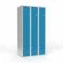 Skoleskab, helsvejst 3x300 med lige tag. Z-døre. Lys grå kabinet (RAL 7035) med pulverlakeret ståldør lys blå (RAL 5012). Leveres med færdigmonteret cylinderlås ASSA 8450 H. Indretningen består af to hylder, en garderobestang med to ankerkroge pr. rum. Totalmål(b x d x h) 900 x 550 x 1750 mm