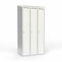 Skoleskab, helsvejst 3x300 med skråt tag. 1 rum i højden. Lys grå kabinet (RAL 7035) med pulverlakeret ståldør hvid (RAL 9003). Leveres med færdigmonteret greb for hængelås ASSA 3906. Totalmål (b x d x h) 900 x 550 x 1900 mm.