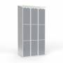 Skoleskab, helsvejst 3x300 med skråt tag. 3 rum i højden. Lys grå kabinet (RAL 7035) med pulverlakeret ståldør grå (RAL 7040). Leveres med færdigmonteret greb for hængelås ASSA 3906. Totalmål (b x d x h) 900 x 550 x 1900 mm.