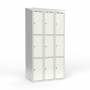 Skoleskab, helsvejst 3x300 med skråt tag. 3 rum i højden. Lys grå kabinet (RAL 7035) med pulverlakeret ståldør hvid (RAL 9003). Leveres med færdigmonteret greb for hængelås ASSA 3906. Totalmål (b x d x h) 900 x 550 x 1900 mm.
