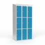 Skoleskab, helsvejst 3x300 med skråt tag. 3 rum i højden. Lys grå kabinet (RAL 7035) med pulverlakeret ståldør lys blå (RAL 5012). Leveres med færdigmonteret cylinderlås ASSA 8450 H. Totalmål (b x d x h) 900 x 550 x 1900 mm.