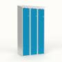 Skoleskab, helsvejst 3x300 med skråt tag. Z-døre. Lys grå kabinet (RAL 7035) med pulverlakeret ståldør lys blå (RAL 5012). Leveres med færdigmonteret greb for hængelås ASSA 3906. Indretningen består af to hylder, en garderobestang med to ankerkroge pr. rum. Totalmål (b x d x h) 900 x 550 x 1900 mm