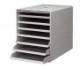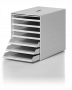 Skuffekabinet med syv åbne skuffer der gør det muligt at ilægge papirer uden at åbne skufferne. Opbevaringsboksen kan placeres på skrivebordet, monteres under bordet eller hænges på væggen. Passer til dokumenter op til C4 format. Med bærehåndtag på toppen og frontplade som kan indskydes og udstyres. Mål: 250x322x365mm (BxHxD)