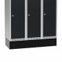 Sokkel for garderobeskab med bredde 900 mm og dybde 400 mm. Soklen giver en pæn afslutning mod gulvet, letter adgangen til skabet og har en højde på 150 mm, som lægges til garderobeskabets højde. Leveres som standard pulverlakeret i sort RAL 9005.