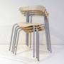 Stabelbar stol Olle med formpresset sæde og ryg i birklaminat. Lakeret stålstel med fast filtgulvbeskyttelse. Ophænges på armlæn. Anbefales som kantinestol.