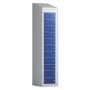 Tøjudleveringsskab, helsvejst i stål for udlevering af tøj, 1 x 400 mm med skråt tag og dimension (HxBxD) 1902 x 400 x 550 mm. Tøjudleveringskabet har kabinet i lys grå farve RAL 7035 og blå RAL 5010 døre, 1 x 11 døre i højden, og leveres komplet monteret med cylinderlås.