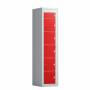 Tøjudleveringsskab, helsvejst i stål for udlevering af tøj, 1 x 400 mm med lige tag og dimension (HxBxD) 1752 x 400 x 550 mm. Tøjudleveringskabet har kabinet i lys grå farve RAL 7035 og rød RAL 3020 døre, 1 x 6 døre i højden, og leveres komplet monteret med greb f/hængelås.