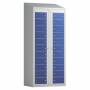 Tøjudleveringsskab, helsvejst i stål for udlevering af tøj, 2 x 400 mm med skråt tag og dimension (HxBxD) 1902 x 800 x 550 mm. Tøjudleveringskabet har kabinet i lys grå farve RAL 7035 og blå RAL 5010 døre, 2 x 11 døre i højden, og leveres komplet monteret med cylinderlås.