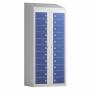 Beskrivelse af Tøjudleveringsskab 2x11 rum med skråt tag og blå døre med greb f/hængelås