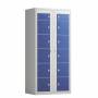 Beskrivelse af Tøjudleveringsskab 2x6 rum med lige tag og blå døre med greb f/hængelås