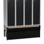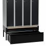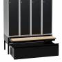 Komplet understel til garderobeskab med bredde 1200 mm og dybde 550 mm, inklusive benramme, udtrækkelig skuffe og udtrækkelig bænk. Understellet er testet og godkendt i henhold til standarden EN16121:2024, leveres i sortlakeret RAL9005-udførelse og med udtrækkelig bænk med laminatsæde. Benrammen har justerskruer til ujævne gulve, så højden kan indstilles mellem 438 og 478 mm. Dette kommer ud over skabets højde. Som udgangspunkt leveres understellet usamlet, men kan også leveres færdigsamlet mod et pristillæg. Bænken på dette understel kan trækkes ud 300 mm, har birke laminat F7921 sædeflade og er godkendt til en brugervægt på op til 150 kg. Sædehøjden er 428–468 mm, afhængigt af hvordan benrammens justerskruer er indstillet. Den udtrækkelige skuffe har en opbevaringskapacitet på 70 kg samt en højde på 255 mm, dybde på 505 mm og bredde på 1095 mm. Skuffen kan trækkes ud 500 mm og leveres forberedt til alle vores standard ASSA- eller Eurolocks-cylinderlåse. Ved bestilling sammen med garderobeskabe kan skab og skuffe leveres med ligelåsende cylinderlåse. Giv besked om ønsket lås ved bestilling. Låsesystem til skuffe mod pristillæg.