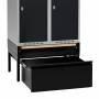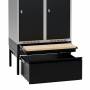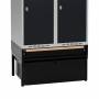 Komplet understel til garderobeskab med bredde 800 mm og dybde 550 mm, inklusive benramme, udtrækkelig skuffe og udtrækkelig bænk. Understellet er testet og godkendt i henhold til standarden EN16121:2024, leveres i sortlakeret RAL9005-udførelse og med udtrækkelig bænk med laminatsæde. Benrammen har justerskruer til ujævne gulve, så højden kan indstilles mellem 438 og 478 mm. Dette kommer ud over skabets højde. Som udgangspunkt leveres understellet usamlet, men kan også leveres færdigsamlet mod et pristillæg. Bænken på dette understel kan trækkes ud 300 mm, har birk laminat F7921 sædeflade og er godkendt til en brugervægt på op til 150 kg. Sædehøjden er 428–468 mm, afhængigt af hvordan benrammens justerskruer er indstillet. Den udtrækkelige skuffe har en opbevaringskapacitet på 70 kg samt en højde på 255 mm, dybde på 505 mm og bredde på 695 mm. Skuffen kan trækkes ud 500 mm og leveres forberedt til alle vores standard ASSA- eller Eurolocks-cylinderlåse. Ved bestilling sammen med garderobeskabe kan skab og skuffe leveres med ligelåsende cylinderlåse. Giv besked om ønsket lås ved bestilling. Låsesystem til skuffe mod pristillæg.