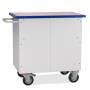 SPEC. TILBUD: FÅ EN GRATIS ELEVATORTAVLE (varenr. 106779) MED I PRISEN / SÅ LÆNGE LAGER HAVES (udgået farve) Værkstedsvogn med lakereret træfiner bordplade og nedfræset stålkant rundt om hele arbejdsoverfladen. Vognen har 10 skuffer som alle leveres med gummimåtte og central cylinderlås. Skuffeudtræk er med kuglelejer og 100% udtræk. Vognen leveres med to faste og to drejelige Ø150mm hjul heraf 2 med brems. Kabinet er lysegrå (RAL 9002) og skuffer er blå (RAL 5005). Nyttemål: Skuffer 510x370 mm DxB. Hjul og håndtag eftermonteres ved udpakning.