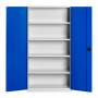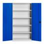 Værktøjsskab SMV er et helsvejst og meget stabilt opbevaringsskab, låsbar og med 2 døre, udvendig højde 1990 mm og bredde 1000 mm. Skabet leveres med 4 stk. flytbare hylder med kapacitet på hele 100 kg, og er miljørigtig pulverlakeret. Skabet kan suppleres med en række tilbehør i SMV-serien. Kabinet lys grå RAL 9002 og blå døre RAL 5005.